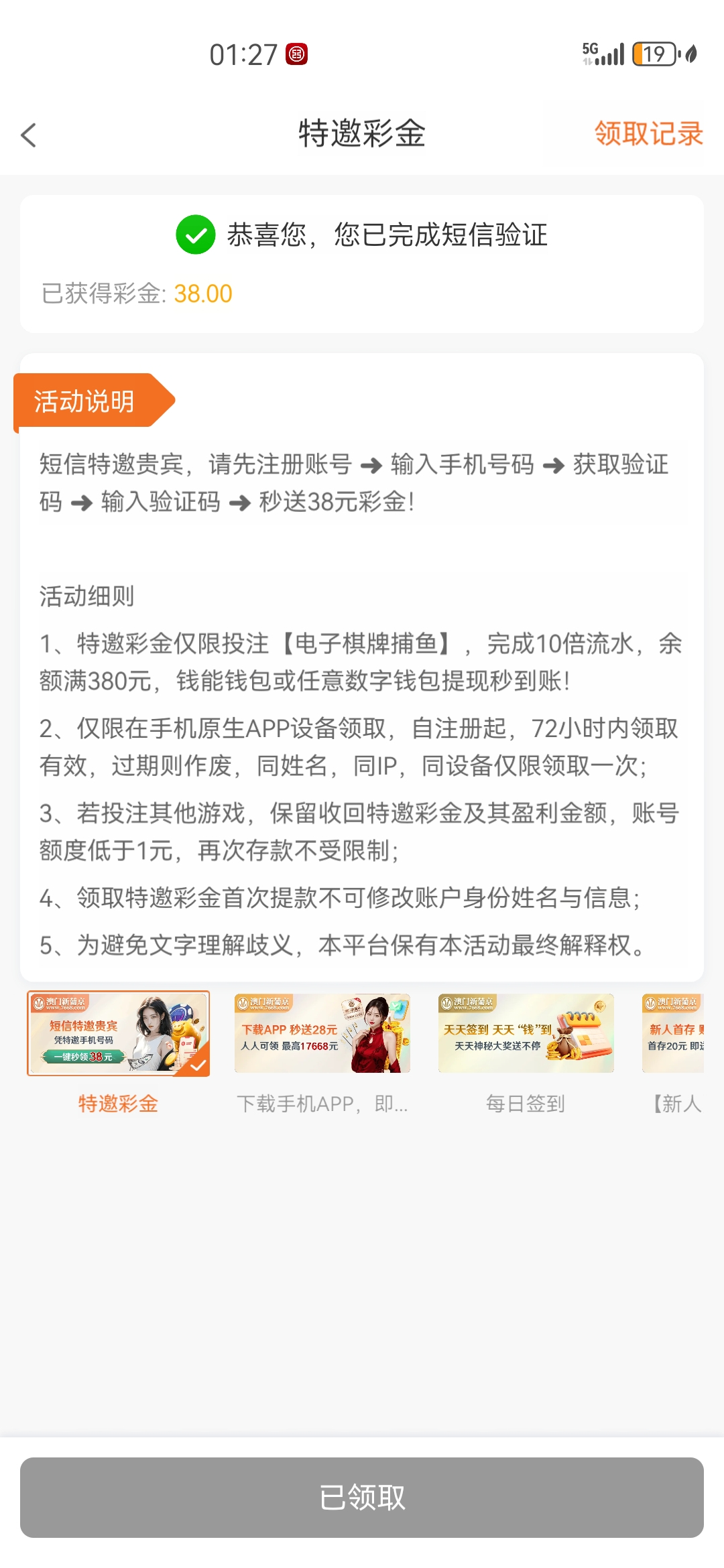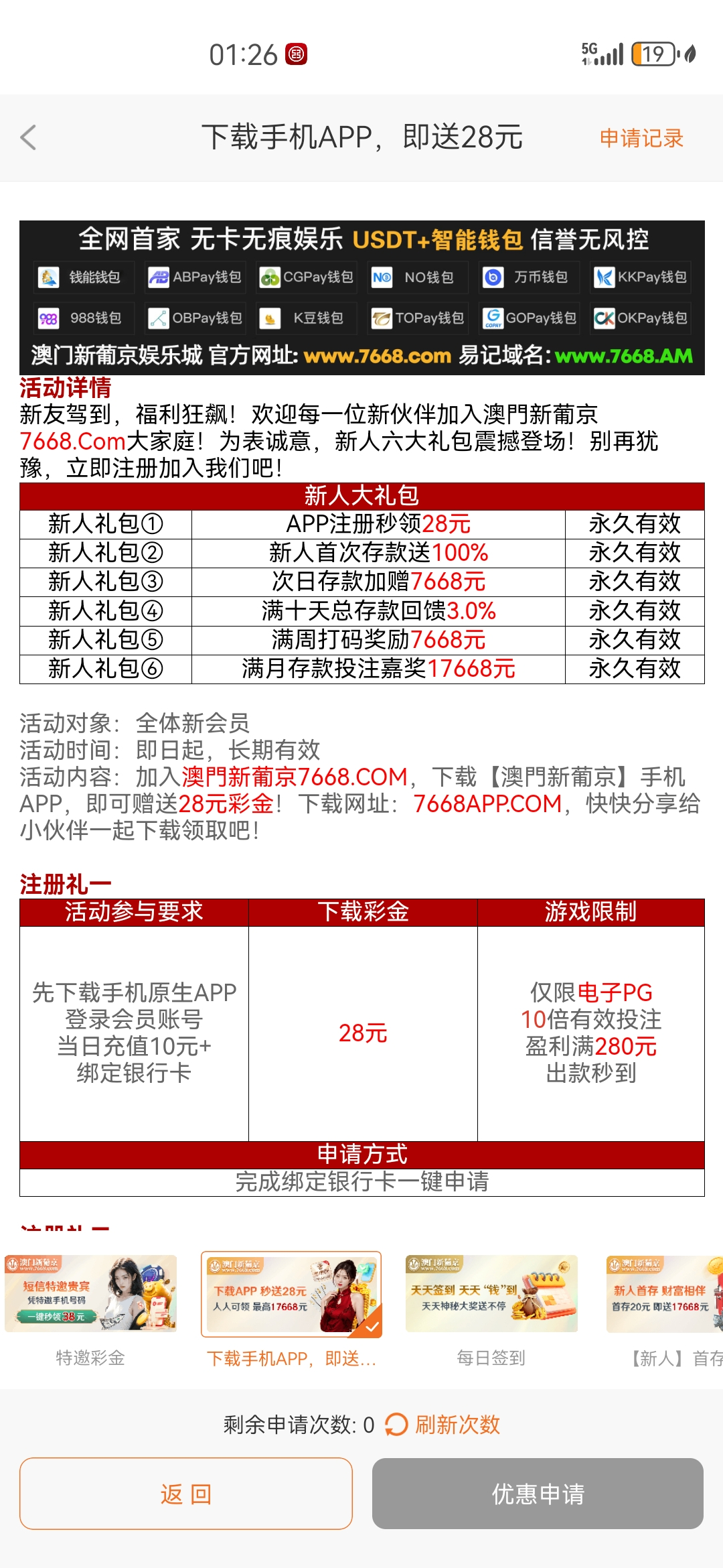 可以去碰瓷一下,勿充值。没有短信特邀的,就去申请28